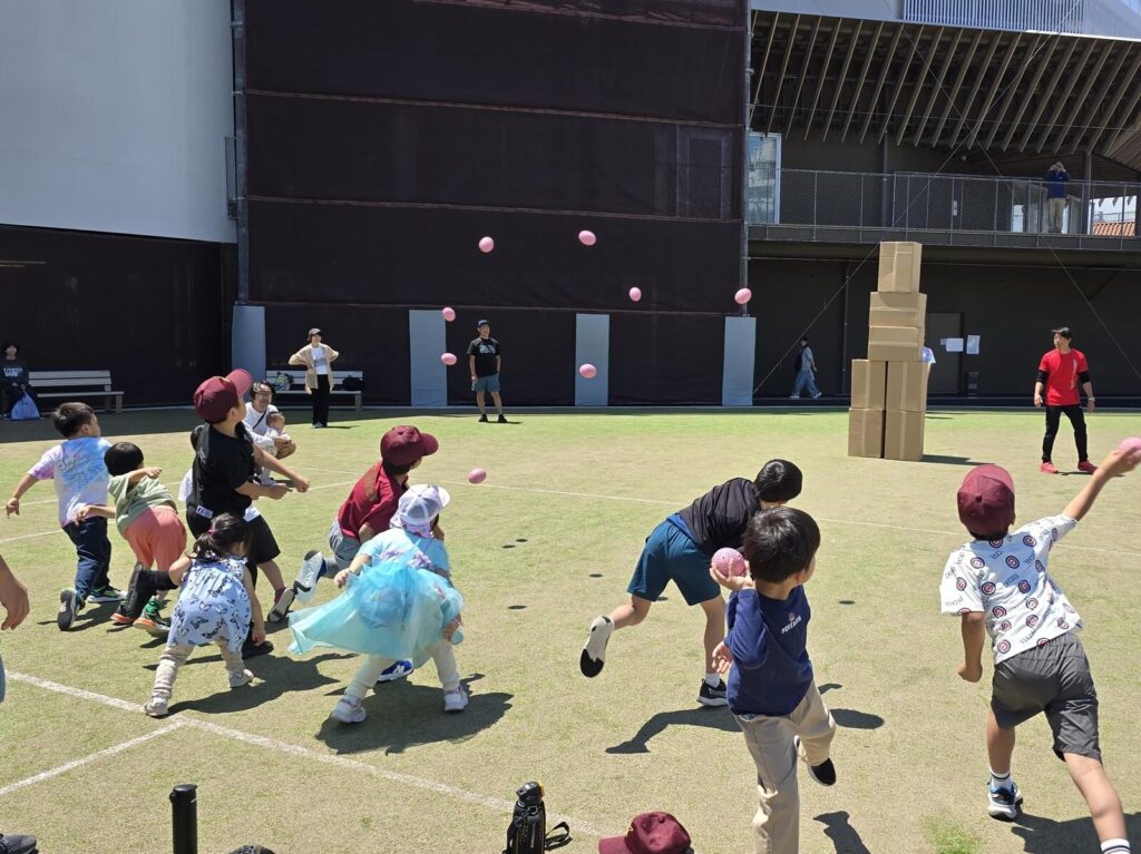 内容:子どもの運動能力低下が叫ばれる中、ボール遊びの習慣をつけ、運動センスを育てる目的で開発した「エリプスセンス」を使用して、自然と正しいボールの握り方を身につけ、ボールを投げる能力向上を目指します。プログラムでは、ボールに慣れる運動から始まり、実際に遠投や的当てを行います。