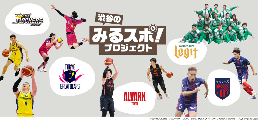 「みるスポ!」に参加するのは、バスケットボール・B1リーグの「サンロッカーズ渋谷」と「アルバルク東京」、サッカー・J1リーグの「FC東京」、バレーボール・SVリーグの「東京グレートベアーズ」、ダンス・Dリーグの「CyberAgent Legit(サイバーエージェント・レジット)」の5チーム。いずれも、渋谷区をホーム拠点にしていたり、競技会場が区内やその近郊にあるなど、渋谷区に縁のあるチームです。競技種目の枠を超えて、ひとつの「TEAM SHIBUYA」として地域とつながる、新しい観戦体験を創っていきます。