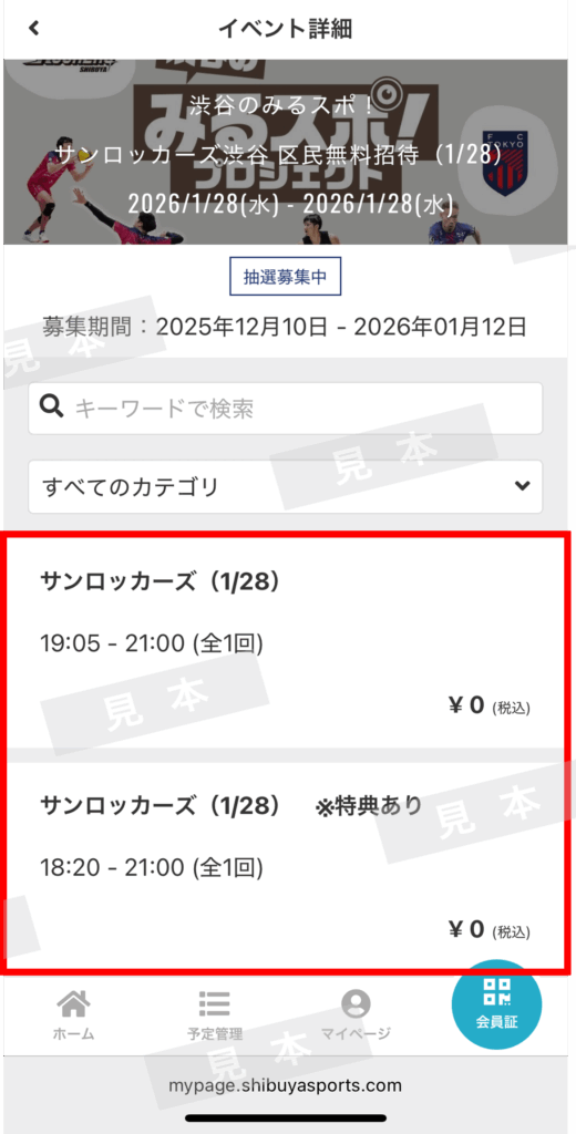 「サンロッカーズ渋谷 区民無料招待(1/28)」を選びます。(図は例です。)