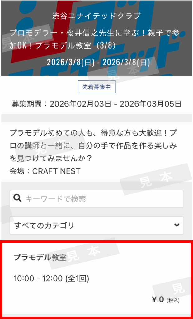 「プロモデラー・桜井信之先生に学ぶ!親子で参加OK!プラモデル教室」のご希望の日程を選択します。(例として(3/8)を選択します。)