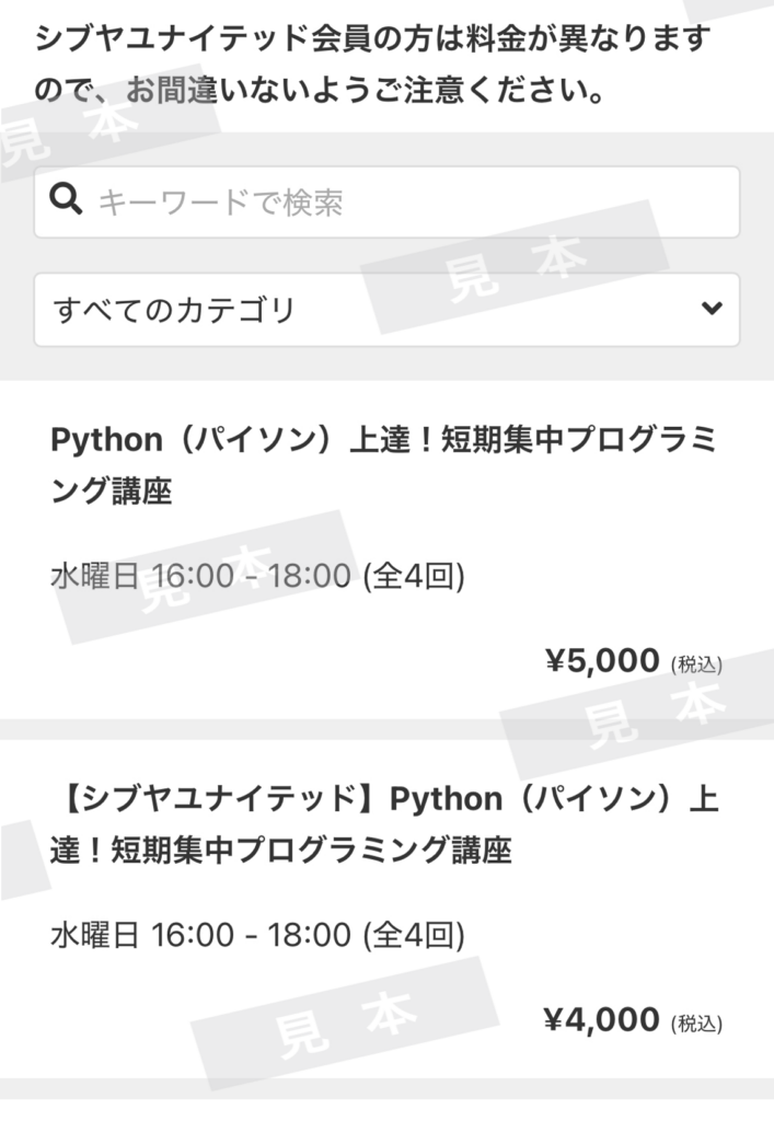 シブヤユナイテッド会員の方は「【シブヤユナイテッド】Python(パイソン)上達!短期集中プログラミング講座」を選択します。