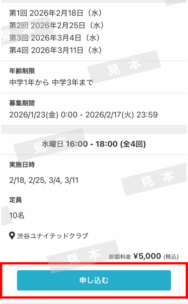 選択した内容に間違いがなければ「申し込む」を押します。(図は例です。)次の画面でクレジットカードをご登録ください。