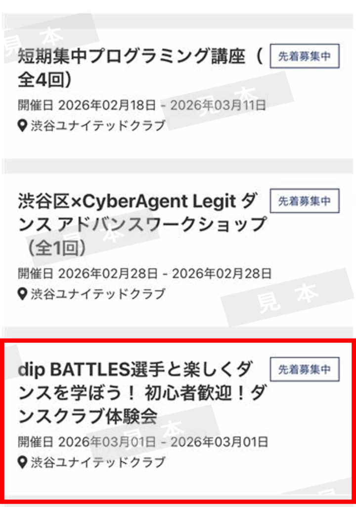 「dip BATTLES選手と楽しくダンスを学ぼう! 初心者歓迎!ダンスクラブ体験会」を選択します。