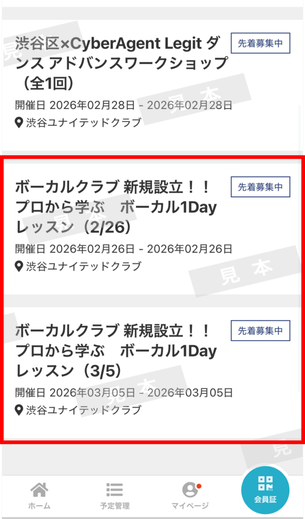 「ボーカルクラブ 新規設立!! プロから学ぶ ボーカル1Dayレッスン」のご希望の日程を選択します。(例として(2/26)を選択します。)